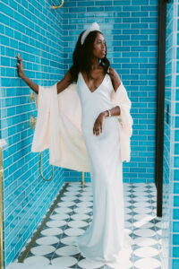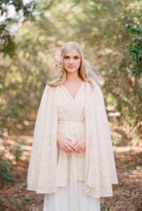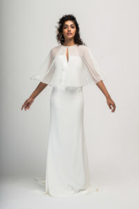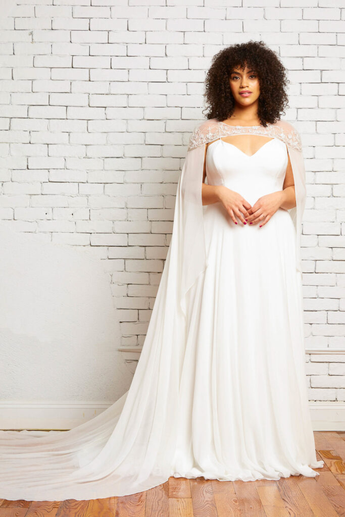 Capes have been a really fun new addition to our racks! Designers like Rebecca Schoneveld and Claire La Faye have been killing the cape game with their effortless drama and romantic flow. There’s a few different options for capes: they can attach with a button or clasp around your neck (think superwoman – but make it fashion) or your seamstress can attach a closure to the cape and the straps of your dress. Both ways are great for keeping the cape removable and versatile so you can wear it however you want on your wedding day!