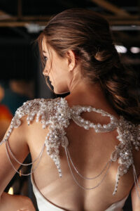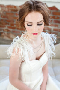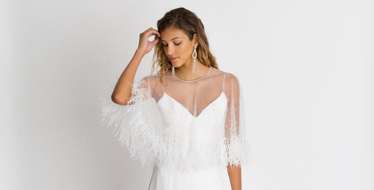 A capelet is just what it sounds like – a smaller version of a cape without any kind of train. They can be flowy like a traditional cape or Veil Trends has a line of their Revel caplettes that act more like jewelry with fun pops of sparkle and (how cool is this?) feathers!