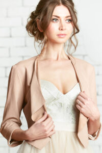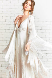 Bridal jackets are perfect for a winter bride or anyone who wants to stay cozy and warm on that trip down the aisle. From the more structured blazer feel to the free-flowing kimono look, there is a wide enough variety that you are sure to find the perfect one for your occasion! We don’t have any in stock right now, but if you see one that you are just dying to try on just give us a shout and we will look into getting it on loan for you!